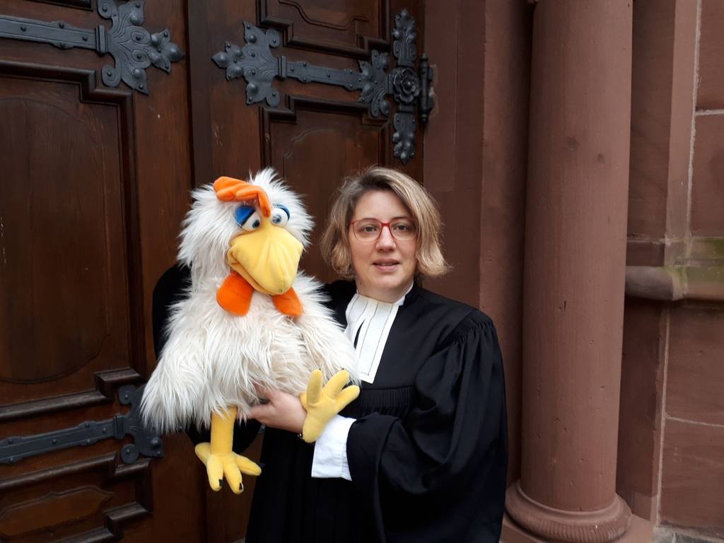 Der neugierige, schlaue und durchaus bibelkundige Hahn Otto, mit dem Pfarrerin Gustrau als Bauchrednerin in lockeren Abständen seit 2018 in oihren Predigten Zwiesprache hielt, wird den Umzug nach Frankfurt und Offenbach mitmachen. Es kann durchaus sein, dass er auch am neuen Wirkungsort krähen wird. (dv) Foto: privat