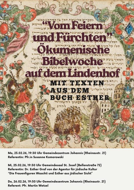 (17.02.2025, Mannheim) In der biblischen Erzählung bewegt sich das Leben der Königin Ester zwischen Feiern und Verfolgung. Beim Lesen stellt sich die Frage, wo Gott ist und bleibt. Eine Frage, die auch in die heutige Zeit passt. Die ökumenische Bibelwoche lädt ein, dem beim Lesen im Buch Ester nachzuspüren. Die Abende in den Stadtteilen Lindenhof und Sandhofen im Zeitraum vom 23. bis 26. Februar können auch einzeln besucht werden.