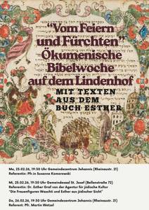 Im Februar nun geht es um das biblische Buch Ester, das wie ein schrill-düsteres Wackelbild vielschichtig schillert. Beschrieben wird darin ein pralles Leben zwischen Feiern und Fürchten. „Gott“ kommt darin gar nicht vor. Der Text stellt mehr Fragen, als dass er Antworten liefert. Die Frage aller Fragen bleibt: Wo ist und bleibt Gott in diesem Leben? Das Drama der Königin Ester ermutigt zur Gottsuche in einem Leben, in dem sich Gott nicht aufdrängt. Die Erzählung verbindet auch auf besondere Weise mit der Tradition unserer jüdischen Geschwister.